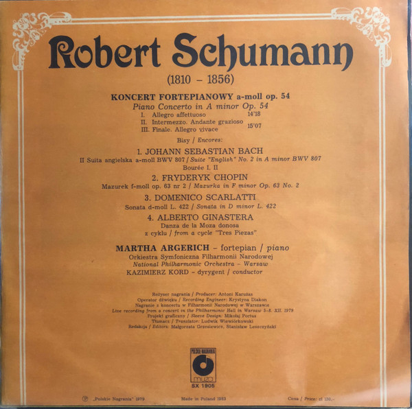 Koncert fortepianowy a-moll op. 54 / Robert Schumann ; II Suita angielska a-moll BWV 807 Bourée I, II / Johann Sebastian Bach. Mazurek f-moll op. 63 nr 2 / Fryderyk Chopin. Sonata d-moll L. 422 / Domenico Scarlatti. Danza de la Moza donosa z cyklu "Tres Piezas" / Alberto Ginastera.