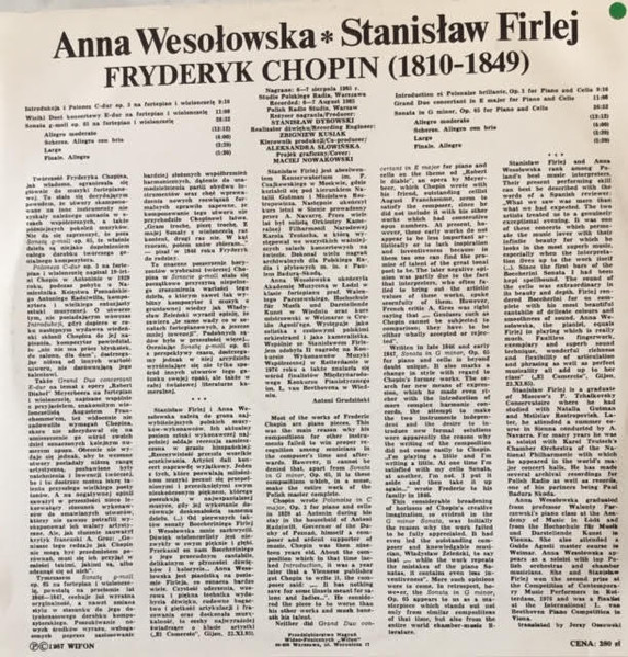Zawiera: Introdukcja i Polonez C-dur op. 3 na fortepian i wiolonczelę (9:10) ; Wielki Duet koncertowy E-dur na fortepian i wiolonczelę (11:08) ; Sonata g-moll op. 65 na fortepian i wiolonczelę (26:33).
